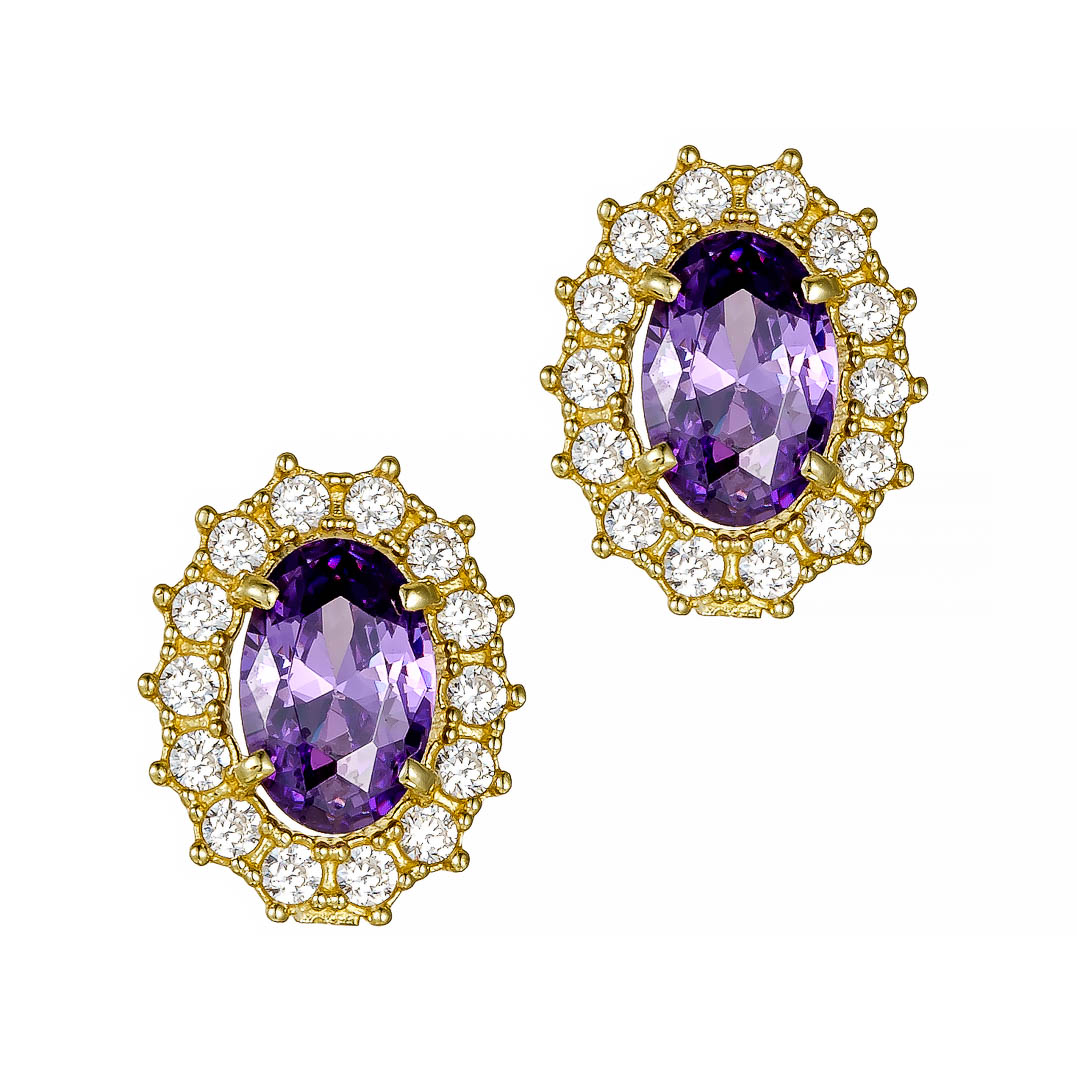 Σκουλαρίκι ροζέτα σε οβάλ σχέδιο με μωβ πέτρες ζιργκόν από χρυσό 9 καρατίων. Εντυπωσιακό κομψό κομμάτι για κάθε περίσταση !!!